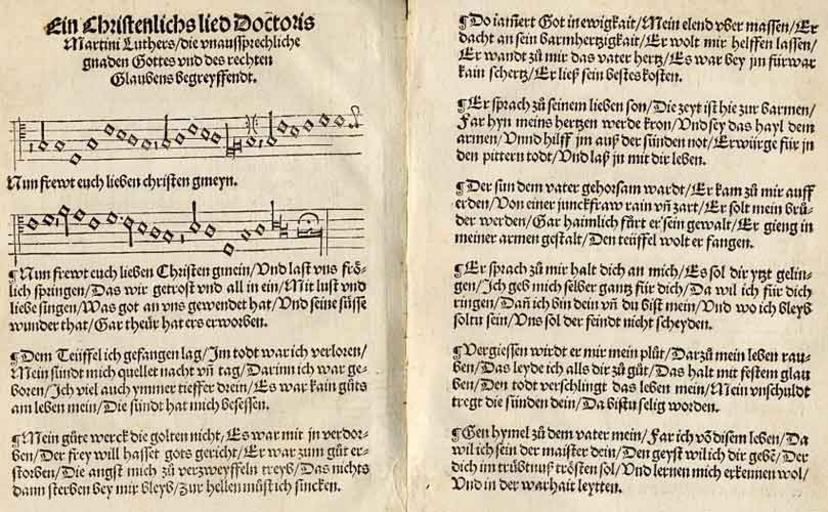 | Keywords: Nun frewtgruber136.2.jpg  en Nun freut euch a hymn by Martin Luther in the Áchtliederbuch the first Lutheran hymnal http //collections lstc edu/gruber/luthers_works/images/gruber136 2 jpg Jobst Gutknecht printer 1524 PD-old-100 Nun freut euch lieben Christen g'mein 1524 books |