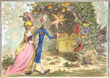 | Keywords: Nuptial-Bower-Gillray.jpeg The Nuptial-Bower; ”with the Evil-One peeping at the Charms of Eden from Milton Js Gy inv fect SUMMARY Cartoon shows William Pitt escorting Eleanor Eden to a vine-shaded bower within which are three large sacks with the British pound symbol on them possibly representing Pitt's debt Bunches of grapes crowns and medallions suspended from ribbons hang from the bower A devil-like creature the Evil-One representing Charles James Fox peers around the bower from the right MEDIUM 1 print etching hand-colored CREATED/PUBLISHED London Pubd by H Humphrey 1797 Feby 13th Also see Wright Evans Historical and Descriptive Account of the Caricatures of James Gillray 1851 OCLC 59510372 pp 95 “8 Library of Congress Prints Photographs Division LC-USZC4-8793 color film copy transparency http //memory loc gov/master/pnp/cph/3g00000/3g08000/3g08700/3g08793u tif uncompressed archival TIFF version 49 MB level color pick white point adjust black level cropped and converted to JPEG quality level 88 with the GIMP 2 4 5 1797-02-13 creator James Gillray No known restriction on publication File The nuptial-bower; - with the evil-one peeping at the charms of Eden' Eleanor Eden; William Pitt; Charles James Fox by James Gillray jpg LOC-image cph 3g08793 PD-old-100 James Gillray Caricatures of William Pitt the Younger Charles James Fox Crowns in art Wine and vineyard engraving |