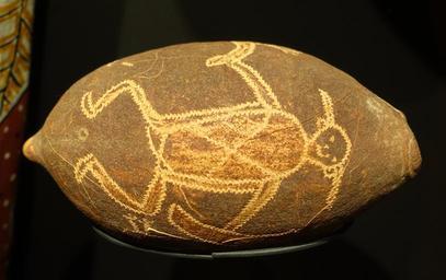 | Keywords: Nut from baobab tree, Kimberly, Australia, c. 1912 - Etnografiska museet - Stockholm, Sweden - DSC01374.JPG en Exhibit in the Etnografiska museet Stockholm Sweden This work is old enough so that it is in the public domain Photography was permitted in the museum without restriction 2014-09-16 own Daderot other versions cc-zero Australia collection in the Etnografiska museet Uploaded with UploadWizard Australian Aboriginal art | ||||