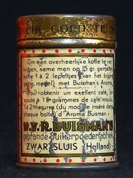| Keywords: NV Buisman koffie verbeteraar sample blikje, foto2.JPG Very old product that is not produced and not sold any more Note that some tins may look the same but when looked for carefully there are some slight differences Photographed at a collector of Droste memorabilia and old tin cans For more info see http //www tincollectors nl/ tincollectors nl or email info tincollectors nl own 2014-02-08 11 15 06 Alf van Beem CC-Zero Coffee tins | ||||