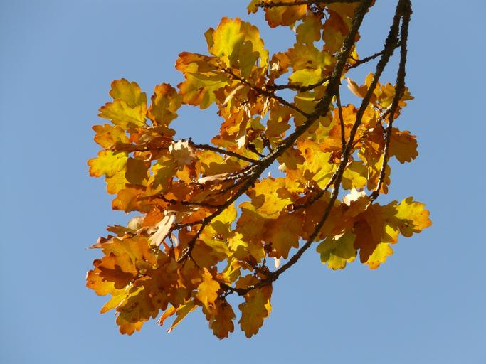 Keywords: oak leaves oak quercus sessile oak quercus petraea winter oak golden autumn golden october autumn october forest leaves golden bright sun back light colorful color tree road fall foliage