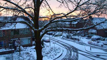 Keywords: oak oak tree snowy snow sunrise winter white nature winter landscape tree freezing branches sun air crossing street houses heaven clouds