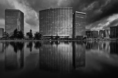 Keywords: oakland california lake water reflections buildings architecture city cities urban sky clouds black and white