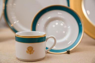 | Keywords: Obama china service blue.jpg Teacup and teacup saucer which form part of the new White House china service on April 27 2015 on display in the China Room of the White House in Washington D C in the United States Each setting of the new china contains 11 pieces and there are 320 settings Most of the pieces have an edge of textured gold a fluted band of color named Kailua blue inspired by the color of the sea off President Obama's home state of Hawaii and a narrow inner band of gold Pickard China of Illinois manufactured the porcelain The teacup is slightly different in that the edge is untextured gilt gold https //www whitehouse gov/sites/default/files/obama_china_service_blue jpg 2015-04-27 The White House Amanda Lucidon photographer PD-USGov Original upload log en wikipedia Obama+china+service+blue jpg wikitable - 2015-04-28 00 51 2800×1867× 405913 bytes BronsonPinchot <nowiki>Photo from www whitehouse gov</nowiki> White House china of the Barack Obama administration |
