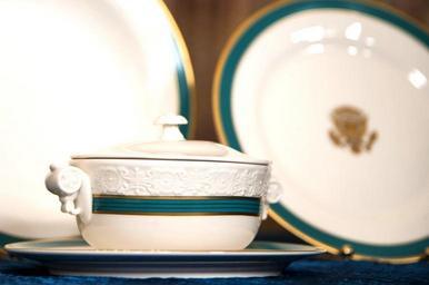 | Keywords: obama china service obamachinaservice white house china whitehousechina pickard china pickardchina 2015 white house china 2015whitehousechina porcelain american porcelain americanporcelain white house porcelain whitehouseporcelain obama porcelain obamaporcelain indoor A dinner plate from the Obama White House china service, plated for use during the state dinner for Japanese Prime Minister Shinzo Abe at the White House in Washington, D.C., on April 28, 2015. This photograph was taken by a White House photographer. As the work of an employee of the federal government created in the performance of his/her duties, it is in the public domain. The White House must order new china about once every 10 years, depending on wear and tear. Recent past colors have included celadon green (Truman), white (with flowers; Johnson), red (Reagan), gold (Clinton), and gold (G.W. Bush). Although dark blue has been used on previous orders of White House china (both the F.D. Roosevelt and Wilson services used it), the type of light blue used by the Obamas has never been used before on American state china. The new Obama service porcelain was designed by First Lady Michelle Obama, with assistance from her friend, the interior designer Michael S. Smith. Planning for the new china began in the fall of 2011, and Obama consulted White House chefs (past and present), White House staff, and the Pickard China company of Illinois on the design and style of the porcelain, pieces, and color. White House dinners are growing ever-larger in size. Existing White House china settings are often used together, mixed and matched so that 400-, 500-, and even 600-setting dinners can be given. Michelle Obama was constrained by the need to design a china service that mixed well with existing china, but which reflected the Obamas' own personal style and tastes. The Obama china service made its debut on April 27, 2015. It was first used on April 28 for a state dinner for Japanese Prime Minister Shinzo Abe. Each setting has 11 pieces and there are 320 settings, for a total of 3,520 pieces in the entire service. The "service plate" or "charger" is the largest piece in the set at 14 inches. A charger is designed to be a placeholder, so that each diner knows to "sit here". As the meal is served, additional elements of the service are placed atop the charger. The charger helps protect the tablecloth from spills, but it also helps act as an aesthetic backdrop to the other pieces of china. The Obama chargers feature a lip of gold gilt, impressed with a fret (Greek key pattern). There is a narrow band of plain gilt on the rim next to the lip, with the rest of the rim in fluted gold gilt. A narrow band of plain gold gilt is placed just inside the well. In the center of the charger is the Presidential coat of arms in gold. The seal should be the first thing the diner sees when they are seated. Each dinner plate is 12 inches in diameter. The lip of the dinner plate is plain gold gilt. The broad rim of the plate lacks gilding or color, and is decorated with pinwheels and fronds in bas-relief. The bas-relief design was taken from an Empire-style china service purchased by then-Secretary of State James Madison in 1806. The bas-relief element is unique to White House china, which has never featured anything like it before. The Obama china service also includes a "second course" 11-inch dinner plate, a 10-inch luncheon plate, a 9-inch salad plate, a 9-inch dessert plate, a 7-inch tureen plate, and a 6-inch saucer. Each of these plates has a lip in gold gilt, impressed with a fret-oval-and-dart motif. Each motif is separated by a double row of dots. The rim of the plate is in a new color designed specifically for the Obama china service. This color is named "Kailua Blue," a bright blue inspired by the hue of the sea in President Barack Obama's home state of Hawaii. The fluted rim of blue is followed by a delicate inner line of gold gilt which completes the decoration. Only about half the rim is taken up by design and color. The dessert plate, the last plate the diner should see, also has the Presidential coat of arms in gold gilt in the center. Each setting comes with a coffee cup. The cup has a lip of plain gold gilt, followed by a narrow band of gold gilt in a dart-oval-dart motif set perpendecular to the lip. This is followed by a band of fluted Kailua blue, and then a delicate band of plain gold gilt again. Each cup has the Presidential coat of arms; if held by the right hand, the coat of arms faces the guest. Unique to the Obama china service is an individual tureen. Although large tureens have been part of White House china before, this is the first time an individual-sized tureen has been designed. The tureen reflects a more modern style of dining, which emphasizes soups, small entrees, or desserts requiring more than a bowl but not a large tureen. Each tureen is small, about 6 inches across. Handles on the side of the tureen are plain, consisting of a scroll with one acanthus leaf above and three below (helping to reinforce the scroll). Each tureen is about 4 inches deep. The lip of the tureen is plain. The rim is designed with the same plain pinwheels-and-fronds design in bas-relief. Below the rim, the side of the tureen is decorated with a narrow band of Kailua blue edged in a delicate line of gold gilt. The lid of the tureen is plain, with a mushroom-motif handle. The cap of the mushroom is fluted, with a botton topping the cap. Pickard China produced the dinnerware. The tureen was incredibly difficult to make. It took workers more than a year and innumerable trials to produce the tureen. The china service was paid for by the White House Historical Association -- a private foundation established by Jacqueline Kennedy to buy furniture, china, and decorative and fine art for the White House. The service cost $367,258. A dinner plate from the Obama White House china service, plated for use during the state dinner for Japanese Prime