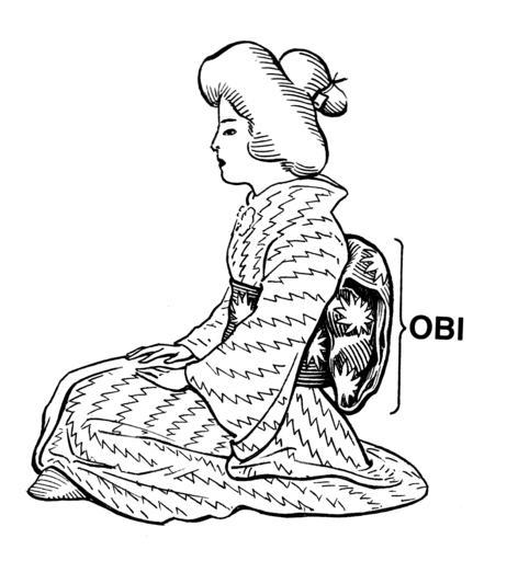 Keywords: Obi (PSF).png Line art drawing of Japanese woman wearing kimono with obi sash marked Piirustus istuvasta japanilaisesta naisesta jolla on yllään kimono Kuvaan on merkitty obi-vyön sijainti PSF O-630000 png other versions Clothing of Japan Obi Kimono Taiko musubi |