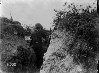 | Keywords: blackandwhite monochrome outdoor black and white A New Zealand intelligence officer observing the enemy lines from a post dug into a trench wall in the front line during World War I. The view from behind the observer shows him in a small space and with his head a little above ground level. Photograph taken Gommecourt Wood 10 August 1918 by Henry Armytage Sanders. Inscriptions: Inscribed - Photographer's title on negative -bottom left: H880. Quantity: 1 b&w original negative(s). Physical Description: Dry plate glass negative 4 x 5 inches Observing the enemy lines from a front line post, Gommecourt Wood, France. Royal New Zealand Returned and Services' Association :New Zealand official negatives, World War 1914-1918. Ref: 1/2-013457-G. Alexander Turnbull Library, Wellington, New Zealand. natlib.govt.nz/records/23215598 A New Zealand intelligence officer observing the enemy lines from a post dug into a trench wall in the front line during World War I. The view from behind the observer shows him in a small space and with his head a little above ground level. Photograph taken Gommecourt Wood 10 August 1918 by Henry Armytage Sanders. Inscriptions: Inscribed - Photographer's title on negative -bottom left: H880. Quantity: 1 b&w original negative(s). Physical Description: Dry plate glass negative 4 x 5 inches Observing the enemy lines from a front line post, Gommecourt Wood, France. Royal New Zealand Returned and Services' Association :New Zealand official negatives, World War 1914-1918. Ref: 1/2-013457-G. Alexander Turnbull Library, Wellington, New Zealand. natlib.govt.nz/records/23215598 |