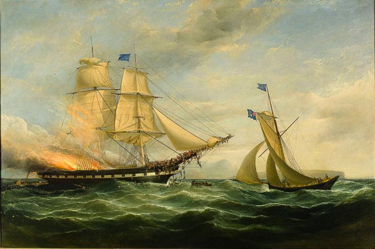 Keywords: Ocean Monarch 1848 byWalters.png Artwork Creator Samuel Walters <small>The Ocean Monarch was one of nine large packet ships built by the famous shipbuilder Donald McKay in Boston for Enoch Train ™s White Diamond Line of Boston-Liverpool vessels The Monarch measured 179 feet in length and 1 301 tons and was launched in July 1847 On August 24 1848 the vessel cleared Liverpool for Boston with 396 passengers including 322 Irish emigrants Just a few hours later a few miles off the coast of Wales a fire around the mainmast was reported probably started by a passenger smoking The Monarch stopped and dropped two anchors to gain control of the fire but it spread too quickly starting a panic among the passengers <br /> Commander Thomas Littledale of the yacht Queen of the Ocean was first on the scene Returning to Liverpool with a group of friends after the Beaumaris regatta he managed to rescue 32 people from the burning ship including Captain Murdoch Other ships picked up another 188 persons; the ship and 178 passengers were lost when the ship sank at its anchors in 85 feet of water <br /> The painting shows the middle stage of the fire with one mast down and red flames at the stern and amidships Panicked people are crowded forward of the smoke and flames overflowing out on the bowsprit and to the very tip of the jib-boom Some survivors can be seen in the sea clinging to the wreckage of the mizzenmast To the right is the yacht Queen of the Ocean and a sailboat <br /> This painting is believed to have been commissioned by Capt Littledale to feature his heroic rescue The Museum owns another Walters painting of the disaster that features another vessel in the foreground and two other Walters paintings in different collections highlight still other vessels ™ rescue of the passengers and crew <br /> The dramatic loss of the Ocean Monarch and so many of its passengers so close to shore so soon after departure as well as its thrilling rescue touched off an international wave of sympathy and a media storm on both sides of the Atlantic </small> 1848 oil canvas cm 79 7 121 3 Smithsonian American Art Museum object history credit line accession number 2005 0279 066 http //americanhistory si edu/onthewater/collection/2005 0279 066 html CIGNA Museum and Art Collection PD-old-100 Samuel Walters Ocean Monarch ship 1848 Paintings in the Smithsonian American Art Museum Walters 1848 paintings Burning ships in art Ship disasters in the 1840s 19th-century sailing ships in paintings