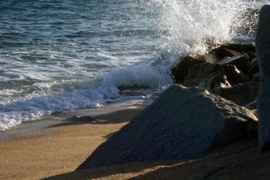 Keywords: ocean waves rocks sea water blue white beach coastal tropical splashes shore tides sunlight bright day sands sandy splashing
