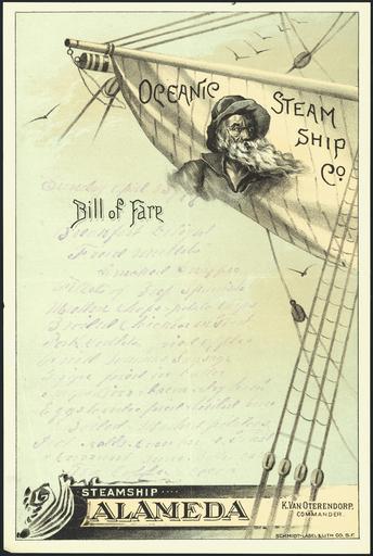 | Keywords: sketch drawing text photo border A breakfast menu, listing: Breakfast delight [?], fried mullets, smoked snapper, fillets of beef Spanish, mutton chops and potato chips, broiled chicken on toast, pork cutlets [with] fried apples, fried [bananas?] sausage, tripe fried in butter, ... liver bacon and ..., eggs ... fried and boiled .., boiled and mashed potatoes, hot rolls ...toast, currant ... tea, coffee, cocoa. The menu is handwritten on to a pre-printed sheet showing the head and shoulders of an old bearded sailor appearing on the sail of a ship. Louisa Jane Spotswood Morice (nee Seddon) was travelling on the 'Alameda' in 1897, to England for Queen Victoria's diamond jubilee celebrations. Quantity: 1 colour photo-mechanical print(s) on flyer.. Physical Description: Lithograph on flier, 228 x 152 mm. Provenance: Similar menu has "Morice album" pencilled on the verso.From the album of Charles George Frederick Morice. Oceanic Steamship Company. Oceanic Steam Ship Company :Steamship Alameda, K Van Oterendorp, commander. Bill of fare. [Sunday April 25, 1897?]. Schmidt Label & Lith Co. S.F. [1897?]. Ref: Eph-A-SHIP-1897-02. Alexander Turnbull Library, Wellington, New Zealand. natlib.govt.nz/records/22710222 A breakfast menu, listing: Breakfast delight [?], fried mullets, smoked snapper, fillets of beef Spanish, mutton chops and potato chips, broiled chicken on toast, pork cutlets [with] fried apples, fried [bananas?] sausage, tripe fried in butter, ... liver bacon and ..., eggs ... fried and boiled .., boiled and mashed potatoes, hot rolls ...toast, currant ... tea, coffee, cocoa. The menu is handwritten on to a pre-printed sheet showing the head and shoulders of an old bearded sailor appearing on the sail of a ship. Louisa Jane Spotswood Morice (nee Seddon) was travelling on the 'Alameda' in 1897, to England for Queen Victoria's diamond jubilee celebrations. Quantity: 1 colour photo-mechanical print(s) on flyer.. Physical Description: Lithograph on flier, 228 x 152 mm. Provenance: Similar menu has "Morice album" pencilled on the verso.From the album of Charles George Frederick Morice. Oceanic Steamship Company. Oceanic Steam Ship Company :Steamship Alameda, K Van Oterendorp, commander. Bill of fare. [Sunday April 25, 1897?]. Schmidt Label & Lith Co. S.F. [1897?]. Ref: Eph-A-SHIP-1897-02. Alexander Turnbull Library, Wellington, New Zealand. natlib.govt.nz/records/22710222 |