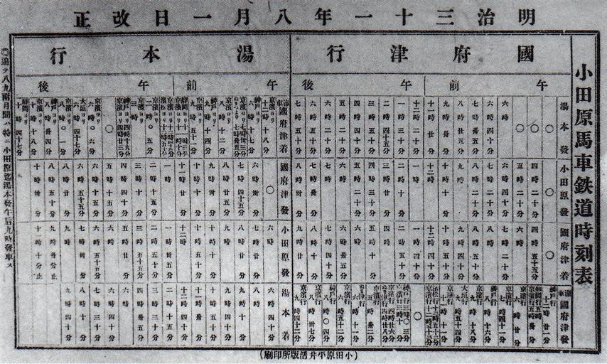 | Keywords: Odawara Basha Tetsudo TimeTable 18980801.jpg  en Timetable of Odawara wagon railway ja 1898年8 1日改正の小田原馬車鉄道時刻表 Japanese Book  すばらしい箱根 グラフ100 p 32 箱根登山鉄道株式会社総務部総務課 1988年8  Author from 1898 PD-Japan-organization PD-Japan-organization Hakone Tozan Railway Public transport timetables of Japan Chinese numerals Japanese writing from right to left |