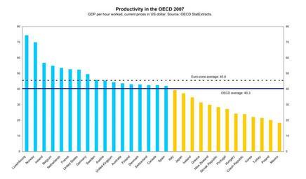 | Keywords: OECD Productivity levels 2007.svg en Productivity comparison for the member states of the OECD Productivity is Gross Domestic Product GDP per hour worked as measured in US dollars Lines for the OECD average and the Euro-zone average shown for comparison http //stats oecd org OECD StatExtracts + Own work by uploader Koyos 2009-06-10 Productivity GDP bar charts OECD |