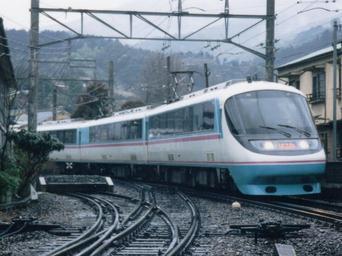 | Keywords: OER 20000 Hakone8 Kazamatsuri 19950318.jpg  Odakyu Electric Railway EMU Type 20000 Hakone No 8 at Kazamatsuri Sta Photo by Cassiopeia_sweet 1995-03-18 Cassiopeia_sweet PD-self 1995 in rail transport in Japan Odakyu 20000 series RSE Hakone train Hakone Tozan Railway Kazamatsuri Station Dual-gauge rail tracks in Japan Trains on curves |
