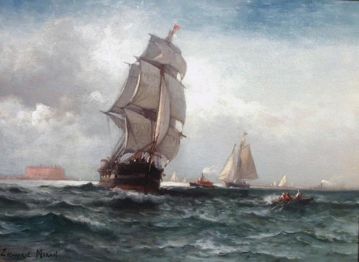 Keywords: Off Governors Island.jpg ca 1870 Oil canvas cm 16 22 object history credit line accession number http //www vallejogallery com/item php title Shipping_Off_Governor's_Island category id 314 PD-old-100 Castle Williams Edward Moran Ships under sail 1870s paintings 19th-century sailing ships in paintings Paintings with signatures lower left |
