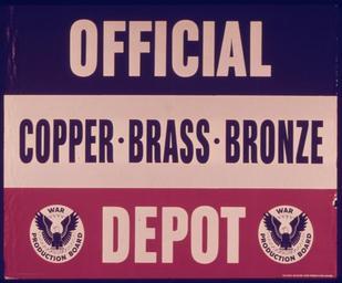 | Keywords: OFFICIAL DEPOT - COPPER BRASS BRONZE - NARA - 515101.tif Scope and content General notes 515101 Local identifier 44-PA-1438 Office for Emergency Management Office of War Information Domestic Operations Branch Bureau of Special Services 03/09/1943 - 09/15/1945 Still Picture Records Section Special Media Archives Services Division NWCS-S National Archives at College Park 8601 Adelphi Road College Park MD 20740-6001 1941 - 1945 Record group Record Group 44 Records of the Office of Government Reports 1932 - 1947 Record group ARC 373 World War II Posters compiled 1942 - 1945 Series ARC 513498 File unit File unit ARC Variant control numbers NAIL Control Number NWDNS-44-PA-1438 yes Other versions <gallery> File OFFICIAL_DEPOT_-_COPPER_BRASS_BRONZE_-_NARA_-_515101 tif tif File OFFICIAL_DEPOT_-_COPPER_BRASS_BRONZE_-_NARA_-_515101 jpg jpg </gallery> NARA-cooperation PD-USGov World War II posters from the United States NARA TIF images with categorized JPGs Metal recycling in the United States War Production Board Scrap metal drives |