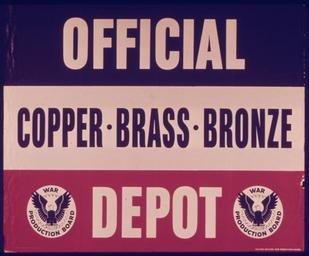 | Keywords: OFFICIAL DEPOT - COPPER BRASS BRONZE - NARA - 515101.jpg Scope and content General notes 515101 Local identifier 44-PA-1438 Office for Emergency Management Office of War Information Domestic Operations Branch Bureau of Special Services 03/09/1943 - 09/15/1945 Still Picture Records Section Special Media Archives Services Division NWCS-S National Archives at College Park 8601 Adelphi Road College Park MD 20740-6001 1941 - 1945 Record group Record Group 44 Records of the Office of Government Reports 1932 - 1947 Record group ARC 373 World War II Posters compiled 1942 - 1945 Series ARC 513498 File unit File unit ARC Variant control numbers NAIL Control Number NWDNS-44-PA-1438 Other versions <gallery> File OFFICIAL_DEPOT_-_COPPER_BRASS_BRONZE_-_NARA_-_515101 tif tif File OFFICIAL_DEPOT_-_COPPER_BRASS_BRONZE_-_NARA_-_515101 jpg jpg </gallery> NARA-cooperation PD-USGov World War II posters from the United States Metal recycling in the United States War Production Board Scrap metal drives |