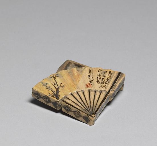 Keywords: Ogata Kenzan - Incense Box in the Shape of a Folding Fan - Walters 491372 - Open.jpg This box used to hold incense pellets represents Kyoto potters' penchant for replicating luxury items also made in Kyoto Kenzan's signature is cleverly incorporated into the colophon on the fan's face which bears a Chinese poem and a painting of a flowering branch century 19 Edo Raku-type earthenware with iron pigment under glaze enamels over glaze cm 5 5 7 7 accession number 49 1372 22026 William T / Henry Walters Collection Baltimore date and mode of acquisition unknown Walters Art Museum Henry Walters Acquired by William T or Henry Walters Master Potters of Japan The Walters Art Gallery Baltimore 1984 place of origin Kyoto Japan <gallery> File Ogata Kenzan - Incense Box in the Shape of a Folding Fan - Walters 491372 - Closed jpg <center>closed </gallery> Walters Art Museum license Art of Japan in the Walters Art Museum Ogata Kenzan Media contributed by the Walters Art Museum needs category review Media contributed by the Walters Art Museum needs artist update Kōgō |