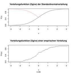 | Keywords: Ogive.svg en Cumulative distribution function for a theoretical and empirical distribution as example for Ogive own Sigbert 2010-11-13 v svg ogive svg par mfrow c 2 1 x <- -350 350 /100 x2 <- -350 0 /100 plot x pnorm x type l xlim c -3 3 main Verteilungsfunktion Ogive der Standardnormalverteilung ylab F x lines x2 1-pnorm x2 lty 2 col red abline h 0 lty 2 col gray abline h 1 lty 2 col gray n <- 50 y <- sort rnorm n plot ecdf y cex 0 xlim c -3 3 main Verteilungsfunktion Ogive einer empirischen Verteilung sub sprintf n i n dev off Cumulative distribution functions Cumulative frequency distribution |
