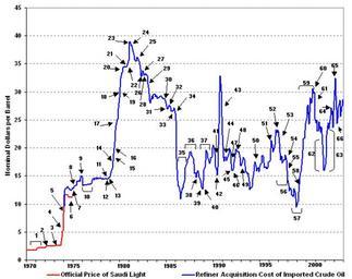 | Keywords: Oil price chronology.gif Energy Information Awareness graph of oil prices OPEC begins to assert power; raises tax rate posted prices OPEC begins nationalization process; raises prices in response to falling US dollar Negotiations for gradual transfer of ownership of western assets in OPEC countries Oil embargo begins October 19-20 1973 OPEC freezes posted prices; US begins mandatory oil allocation Oil embargo ends March 18 1974 Saudis increase tax rates and royalties US crude oil entitlements program begins OPEC announces 15 revenue increase effective October 1 1975 Official Saudi Light price held constant for 1976 Iranian oil production hits a 27-year low OPEC decides on 14 5 price increase for 1979 en Iranian Revolution; Shah deposed OPEC raises prices 14 5 on April 1 1979 US phased price decontrol begins OPEC raises prices 15 Iran takes hostages; President Carter halts imports from Iran; Iran cancels US contracts; Non-OPEC output hits 17 0 million b/d Saudis raise marker crude price from 19 /bbl to 26 /bbl en Windfall Profits Tax enacted Kuwait Iran and Libya production cuts drop OPEC oil production to 27 million b/d Saudi Light raised to 28/bbl Saudi Light raised to 34/bbl First major fighting in en Iran-Iraq War President Reagan abolishes remaining price and allocation controls Spot prices dominate official OPEC prices US boycotts Libyan crude; OPEC plans 18 million b/d output Syria cuts off Iraqi pipeline Libya initiates discounts; Non-OPEC output reaches 20 million b/d; OPEC output drops to 15 million b/d OPEC cuts prices by 5/bbl and agrees to 17 5 million b/d output Norway United Kingdom and Nigeria cut prices OPEC accord cuts Saudi Light price to 28/bbl OPEC output falls to 13 7 million b/d Saudis link to spot price and begin to raise output OPEC output reaches 18 million b/d Wide use of netback pricing Wide use of fixed prices Wide use of formula pricing OPEC/Non-OPEC meeting failure OPEC production accord; Fulmar/Brent production outages in the North Sea Exxon's Valdez tanker spills 11 million gallons of crude oil OPEC raises production ceiling to 19 5 million b/d Iraq invades Kuwait en Operation Desert Storm begins; 17 3 million barrels of SPR crude oil sales is awarded Persian Gulf war ends Dissolution of Soviet Union; Last Kuwaiti oil fire is extinguished on November 6 1991 UN sanctions threatened against Libya Saudi Arabia agrees to support OPEC price increase OPEC production reaches 25 3 million b/d the highest in over a decade Kuwait boosts production by 560 000 b/d in defiance of OPEC quota Nigerian oil workers' strike Extremely cold weather in the US and Europe U S launches cruise missile attacks into southern Iraq following an Iraqi-supported invasion of Kurdish safe haven areas in northern Iraq Iraq begins exporting oil under United Nations Security Council Resolution 986 Prices rise as Iraq's refusal to allow United Nations weapons inspectors into sensitive sites raises tensions in the oil-rich Middle East OPEC raises its production ceiling by 2 5 million barrels per day to 27 5 million barrels per day This is the first increase in 4 years World oil supply increases by 2 25 million barrels per day in 1997 the largest annual increase since 1988 Oil prices continue to plummet as increased production from Iraq coincides with no growth in Asian oil demand due to the Asian economic crisis and increases in world oil inventories following two unusually warm winters OPEC pledges additional production cuts for the third time since March 1998 Total pledged cuts amount to about 4 3 million barrels per day Oil prices triple between January 1999 and September 2000 due to strong world oil demand OPEC oil production cutbacks and other factors including weather and low oil stock levels President Clinton authorizes the release of 30 million barrels of oil from the Strategic Petroleum Reserve SPR over 30 days to bolster oil supplies particularly heating oil in the Northeast Oil prices fall due to weak world demand largely as a result of economic recession in the United States and OPEC overproduction Oil prices decline sharply following the September 11 2001 terrorist attacks on the United States largely on increased fears of a sharper worldwide economic downturn and therefore sharply lower oil demand Prices then increase on oil production cuts by OPEC and non-OPEC at the beginning of 2002 plus unrest in the Middle East and the possibility of renewed conflict with Iraq OPEC oil production cuts unrest in Venezuela and rising tension in the Middle East contribute to a significant increase in oil prices between January and June A general strike in Venezuela concern over a possible military conflict in Iraq and cold winter weather all contribute to a sharp decline in U S oil inventories and cause oil prices to escalate further at the end of the year Continued unrest in Venezuela and oil traders' anticipation of imminent military action in Iraq causes prices to rise in January and February 2003 Military action commences in Iraq on March 19 2003 Iraqi oil fields are not destroyed as had been feared Prices fall OPEC delegates agree to lower the cartel ™s output ceiling by 1 million barrels per day to 23 5 million barrels per day effective April 2004 OPEC agrees to raise its crude oil production target by 500 000 barrels 2 of current OPEC production by August 1 ”in an effort to moderate high crude oil prices en Hurricane Ivan causes lasting damage to the energy infrastructure in the Gulf of Mexico and interrupts oil and natural gas supplies to the United States U S Secretary of Energy Spencer Abraham agrees to release 1 7 million barrels of oil in the form of a loan from the Strategic Petroleum Reserve http //www eia doe gov/emeu/cabs/chron html graph PD-USGov original upload log page en wikipedia Oil_price_chronology gif 2004-12-17 23 37 Stirling Newberry 605×480×8 13594 bytes <nowiki>Energy Information Awareness graph of oil prices pd </nowiki> Category Energy in Nigeria 