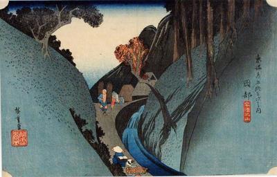 | Keywords: Okabe- Utsu Mountain (5759415016).jpg en <b>Accession Number </b> 1957 233 <b>Display Artist </b> Utagawa Hiroshige <b>Display Title </b> Okabe Utsu Mountain <b>Translation s </b> Okabe Utsu no yama <b>Series Title </b> The Fifty-three Stations of the Tokaido Road known as the Hoeido Tokaido <b>Suite Name </b> Tokaido gojusan tsugi no uchi <b>Creation Date </b> ca 1832-1833 <b>Medium </b> Woodblock <b>Height </b> 9 7/8 in <b>Width </b> 14 3/4 in <b>Display Dimensions </b> 9 7/8 in x 14 3/4 in 25 08 cm x 37 47 cm <b>Publisher </b> Tsuruya Kiemon <b>Credit Line </b> Bequest of Mrs Cora Timken Burnett <b>Label Copy </b> Okabe Station No 22 Series - 53 Stations on Tokaido Road This view of Okabe presents one of the most stunning compositions among the prints from Hiroshiges first and most celebrated series depicting the T kaid stations Woodcutters from the village make their way along the narrow pass of Utsu Valley that follows the route of a swiftly flowing stream Narrow dark and overgrown with lush vegetation and dense forest the pass has been a subject in literature from the early Heian period 7941185 <b>Label Copy Spanish </b> Esta vista de Okabe presenta una de las composiciones ms impactantes entre las primeras y ms clebres impresiones de las estaciones de T kaid Los leadores del pueblo caminan por el angosto paso del valle Utsu que sigue la ruta de un arroyo de corriente rpida Este paso angosto oscuro y lleno de maleza exuberante y bosque denso ha sido un tema en la literatura desde principios del perodo Heian 7941185 <b>Collection </b> <a href http //www sdmart org/art/our-collection/asian-art rel nofollow >The San Diego Museum of Art</a> 2007-05-10 09 21 58 https //www flickr com/photos/thesandiegomuseumofartcollection/5759415016/ Flickr en thesandiegomuseumofartcollection PD-old-100 Files from the San Diego Museum of Art to be checked |
