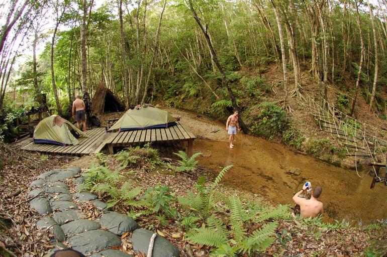 Keywords: okinawa japan landscape nature outside forest trees woods stream rope bridge camp site men