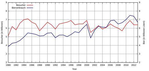| Keywords: Oktoberfest stats de.svg de Entwicklung der Besucherzahlen und des Bierkonsums des Oktoberfests seit 1980 2010-09-18 Created with Gnuplot Own work <br /> Data from http //www muenchen de Gorgo thumb englisch cc-zero Uncategorized 2015 February 1 |