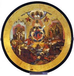 | Keywords: Old believers' icon tondo.jpg en From the iconostasis of the old believers' chapel in the Rastorguyev-Kharitonov's Estate Hosted in the Sverdlovsk Oblast local museum Restored at 1988 by V A Polyakov ru Ста ооб ядческая икона - тондо Едино одный сыне 1814 1822 гг Де ево шпонки в езные сквозные Паволока левкас темпе а золочение 82 × 82 × 3 6 см Из иконостаса домовой молельни Расто гуевых-Ха итоновых асте ская Богаты евых евьянский завод Х анится в Cве дловском областном к аеведческом музее Екате инбу г Россия Рестав ация 1988 Поляков В А Инв И-234 2011-11-25 http //www cirota ru/forum/view php subj 80163 Bohatyryov's icon workshop Nevyansk 1814 - 1822's PD-Art Rastorguyev-Kharitonov's Estate Old Believer icons Sverdlovsk Regional Natural History Museum 19th-century icons of Russia Only begotten Son of God |