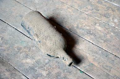 Keywords: old bottle vintage grey dust aged dusty glass wooden floor