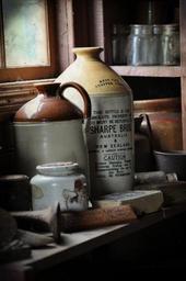 Keywords: old bottle window dust dusty abandoned shelf window sill sad background pottery ceramic ginger victorian rustic kitchen object brown wooden wood close-up garden shed storage building stone decorative