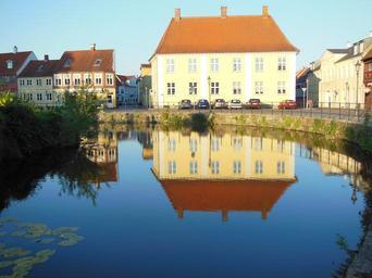 Keywords: old buildings streetscape moat reflections evening atmosphere water houses old street lamps granite stone dam summer weather blue skies shrubs blue red yellow white green gray black