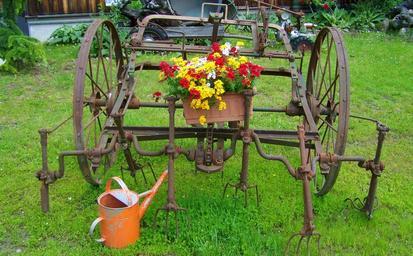 Keywords: old farm tool iron garden decor old watering cans