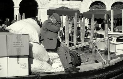 Keywords: old man boat venezia worker old male tourism vessel working boat canals transport person man black and white venice