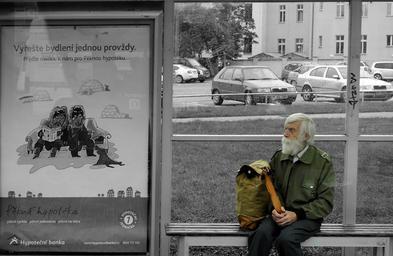 Keywords: old man bus stop black and white