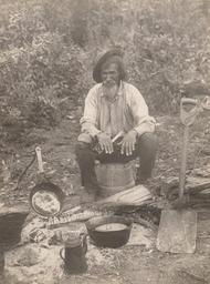 | Keywords: food preparation foodpreparation monochrome outdoor Photographer: Reuben R. Sallows (1855 - 1937) Description: Older man, seated on wooden pail, by fire with a cooking pot, coffee pot and frying pan; scruffy grey beard & moustache; hat at angle on right side of head; sweat-stained shirt with sleeves rolled; left knee of pants and long-johns torn; square shovel with carved handle on right; bush in background; date (1910/90) in pencil and Sallows stamp in blue ink on back Object ID : 0365-rrs-ogohc-ph View additional photographs by Sallows that are held in other collections at the Reuben R. Sallows Digital Library. Order a higher-quality version of this item by contacting the Huron County Museum (fee applies). Photographer: Reuben R. Sallows (1855 - 1937) Description: Older man, seated on wooden pail, by fire with a cooking pot, coffee pot and frying pan; scruffy grey beard & moustache; hat at angle on right side of head; sweat-stained shirt with sleeves rolled; left knee of pants and long-johns torn; square shovel with carved handle on right; bush in background; date (1910/90) in pencil and Sallows stamp in blue ink on back Object ID : 0365-rrs-ogohc-ph View additional photographs by Sallows that are held in other collections at the Reuben R. Sallows Digital Library. Order a higher-quality version of this item by contacting the Huron County Museum (fee applies). |
