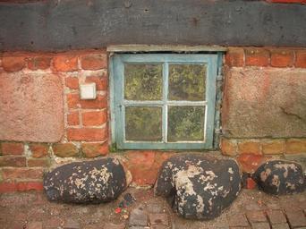 Keywords: old merchant's house detail basement window blue worn algae window abandoned dirty red brick timber white stone black tar special heritage tourism