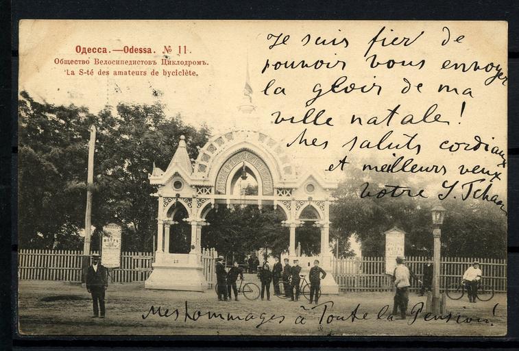 Keywords: Old Odessa CP Obshestvo velosopedistov (zyklodrom).jpg en The society of byciclists-amaters Odessa fr Le s-tè des amateurs de byciclète Odessa ru Общество велосипедистов Циклод ом Одесса uk Това иство велосипедистів Циклод ом Одеса Postcard scan Grand Odessa serie 1902 «Phototypie Scherer Nabholz Co Moscow» Большая Одесская се ія «Фототипiя Ше е ъ абгольцъ и Ко осква» Albert Mei ей Альбе т Иванович before 1902 100px PD-RusEmpire Postcards of Odessa Phototypie Scherer Nabholz Co Grand serie French inscriptions |