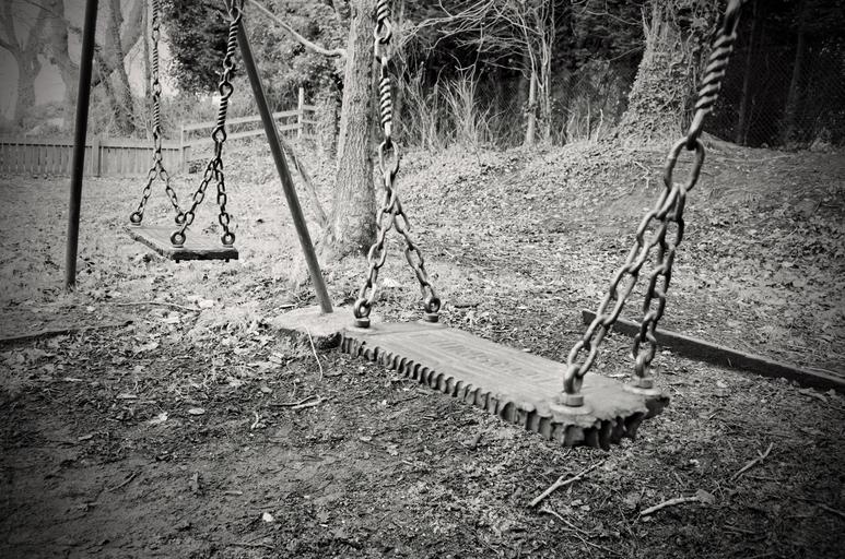 Keywords: old swing swings abandoned child macro chains mesh seat black white ground background fun