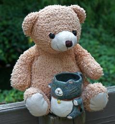 Keywords: old teddy bear with mug teddy bear toy stuffed animal mug kitty mug cute handmade craft handicraft clay