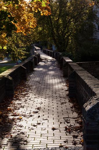 Keywords: old town city wall autumn fall foliage golden autumn leaves leaves in the autumn golden october yellow trees pflster sidewalk promenade back light