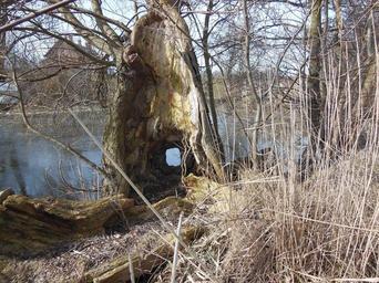 Keywords: old tree stump hollow tree stump peephole hollow moat water dry grass blue brown beige nature