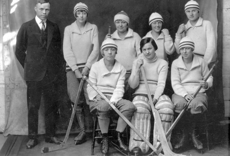 | Keywords: hockey alberta ice hockey icehockey blackandwhite monochrome people black and white Olds, Alberta. L - R: back - Coach?, Aileen Duff, Maybert Hall, Violet Gilbertson, Alice Bentz Sitting - Isabell Whitelock, Lily Campbell, Gladys Frost. ca. 1921, A4647. Olds, Alberta. L - R: back - Coach?, Aileen Duff, Maybert Hall, Violet Gilbertson, Alice Bentz Sitting - Isabell Whitelock, Lily Campbell, Gladys Frost. ca. 1921, A4647. | ||||