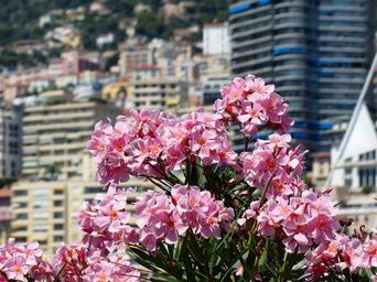 Keywords: oleander flower flowers pink nerium oleander laurel rose nerium dog gift greenhouse apocynaceae toxic container plant homes city view monaco foreground background out of focus tiefenschärfe