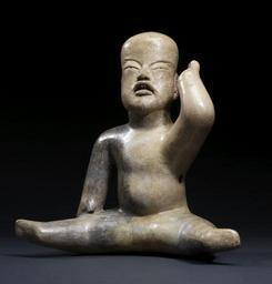 | Keywords: Olmec - Infantile Figure - Walters 20092064 - Three Quarter.jpg Hollow figures portraying a seated person resembling an infant are unique to Olmec art most examples coming from funerary and ritual deposits from the central Mexican highland states of Morelos and Puebla Most were intentionally broken prior to burial in ritual caches Some examples might have functioned as surrogates for infant sacrifices or when found in adult burials as symbols of spiritual rebirth Others have symbolic icons carved incised or painted on their heads or backs The incised and painted emblem on the top and rear of this figure's head has been associated with the god of springtime and regeneration The motif also resembles the four-dots and- bar icon interpreted as a diagram of Olmec cosmology Yet it is most similar to the iconographic complex that distinguishes the Olmec maize god including this deity's essential cleft-head Many of these figures are in a seated position with outstretched legs gesturing with an upraised arm or similar measured body position Depicted with a slightly open mouth and upraised eyes and lacking genitalia these enigmatic figures seem to reject the adult human condition and embrace the spirit form The seated position and limited repertoire of gestures suggest disciplined meditative exercises that would assist the shaman in his/her spiritual journey Nonsexed figures of adults in contorted positions are relatively common in Olmec art from monumental versions carved in stone to diminutive examples modeled in clay They may depict postures taken by shamans whether actual or metaphorical for the rigors of spiritual transformation The practice survives today among Huichol shamanic celebrants in northern Mexico between 1200 900 BC Early Formative earthenware burnished slip post-fire paint red cm 31 1 33 3 16 accession number 2009 20 64 80219 Stendahl Galleries Los Angeles date and mode of acquisition unknown John G Bourne 1970s by purchase Walters Art Museum Gift of John Bourne 2009 place of origin central Central Highlands Walters Art Museum license Olmec art in the Walters Art Museum Olmec ceramic figurines Media contributed by the Walters Art Museum needs category review |