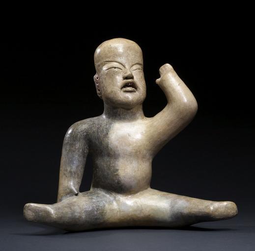 Keywords: Olmec - Infantile Figure - Walters 20092064.jpg Hollow figures portraying a seated person resembling an infant are unique to Olmec art most examples coming from funerary and ritual deposits from the central Mexican highland states of Morelos and Puebla Most were intentionally broken prior to burial in ritual caches Some examples might have functioned as surrogates for infant sacrifices or when found in adult burials as symbols of spiritual rebirth Others have symbolic icons carved incised or painted on their heads or backs The incised and painted emblem on the top and rear of this figure's head has been associated with the god of springtime and regeneration The motif also resembles the four-dots and- bar icon interpreted as a diagram of Olmec cosmology Yet it is most similar to the iconographic complex that distinguishes the Olmec maize god including this deity's essential cleft-head Many of these figures are in a seated position with outstretched legs gesturing with an upraised arm or similar measured body position Depicted with a slightly open mouth and upraised eyes and lacking genitalia these enigmatic figures seem to reject the adult human condition and embrace the spirit form The seated position and limited repertoire of gestures suggest disciplined meditative exercises that would assist the shaman in his/her spiritual journey Nonsexed figures of adults in contorted positions are relatively common in Olmec art from monumental versions carved in stone to diminutive examples modeled in clay They may depict postures taken by shamans whether actual or metaphorical for the rigors of spiritual transformation The practice survives today among Huichol shamanic celebrants in northern Mexico between 1200 900 BC Early Formative earthenware burnished slip post-fire paint red cm 31 1 33 3 16 accession number 2009 20 64 80219 Stendahl Galleries Los Angeles date and mode of acquisition unknown John G Bourne 1970s by purchase Walters Art Museum Gift of John Bourne 2009 place of origin central Central Highlands Walters Art Museum license Olmec art in the Walters Art Museum Olmec ceramic figurines Media contributed by the Walters Art Museum needs category review |