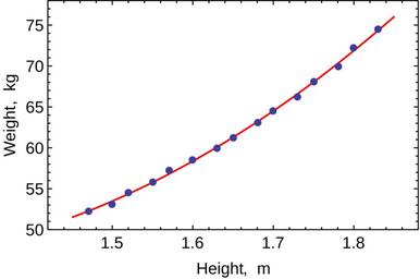 | Keywords: OLS example weight vs height fitted line.svg en Example of OLS regression of weight against height of american women; this picture shows dataset and fitted regression line Own Stpasha 2009-07-05 Source code Mathematica <nowiki> H 1 47 1 50 1 52 1 55 1 57 1 60 1 63 1 65 1 68 1 70 1 73 1 75 1 78 1 80 1 83 ; W 52 21 53 12 54 48 55 84 57 20 58 57 59 93 61 29 63 11 64 47 66 28 68 10 69 92 72 19 74 46 ; Show Plot128 8128 - 143 1620 h + 61 9603 h 2 h 1 45 1 85 PlotStyle -> Thickness0 005 Hue0 PlotRange -> 1 42 1 88 50 78 AxesOrigin -> 1 42 78 Frame -> True FrameLabel -> Height m Weight kg FrameStyle -> DirectiveFontFamily-> Helvetica 14 Thickness->0 003 ListPlotTable Hi Wi i 1 15 PlotStyle -> PointSize0 02 Export wh-fitted svg ;</nowiki> Check categories 2009 July 7 en wikipedia Ordinary_least_squares Control theory 3 Control theory Regression analysis Signal processing |