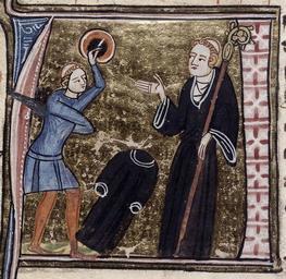 | Keywords: Omne Bonum Royal6EVI115 Apostata.jpg en original caption at http //www bl uk/catalogues/illuminatedmanuscripts/ILLUMIN ASP Size mid IllID 40302 bl uk Detail of an historiated initial 'A' postate of a tonsured ex-cleric armed with a sword and a shield and his black habit on the ground facing an abbot British Library Royal MS 6 E VI fol 115 James le Palmer / anonymous illustrator century 14 PD-old-100 Omne Bonum c 1360-c 1375 - BL Royal MS 6 E VI and VII Fencing in the 14th century Men with swords in art Apostasy Tonsure Clothing in medieval miniatures |