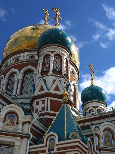 Keywords: omsk cathedral building church towers russia old historical landmark outside architecture design intricate