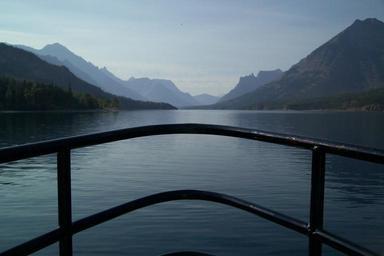 | Keywords: glacier national park glaciernationalpark waterton-glacier international peace park watertonglacierinternationalpeacepark waterton-glacier watertonglacier waterton lake watertonlake scenery mountains glacial lake glaciallake boat canada international boundary internationalboundary border outdoor water The view from the bow of the M.V. International, the boat which brings visitors from Waterton Lakes National Park of Alberta, Canada to Goat Haunt Ranger Station in Glacier National Park, United States. At left, in silhouette, is the Peace Park's tallest mountain. Mt. Cleveland stands at 10,466 feet, or 3,190 meters, and its north face (seen here) boats the highest vertical rise in the Rocky Mountains. Photo: David Restivo, NPS The view from the bow of the M.V. International, the boat which brings visitors from Waterton Lakes National Park of Alberta, Canada to Goat Haunt Ranger Station in Glacier National Park, United States. At left, in silhouette, is the Peace Park's tallest mountain. Mt. Cleveland stands at 10,466 feet, or 3,190 meters, and its north face (seen here) boats the highest vertical rise in the Rocky Mountains. Photo: David Restivo, NPS |