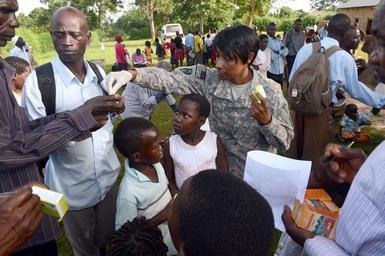 | Keywords: One Health 130423-N-IZ662-619.jpg en U S Army Maj Daisy Wilson a public-health nurse from the 411th Civil Affairs Battalion 411th CA BN in support of Combined Joint Task Force-Horn of Africa CJTF-HOA gives multivitamins to villagers in Kakute Uganda April 23 2013 Together with healthcare experts from the Uganda People šÃ„ôs Defense Force UPDF the CJTF-HOA Surgeon Cell and 411th CA BN soldiers dispensed the vitamins and taught villagers how to improve water food and personal hygiene sanitation procedures to help prevent the spread of disease -- a goal of One Health Overall One Health is a whole-of-government program coordinated by the Ugandan government UPDF U S Agency for International Development U S State Department U S Embassy in Uganda and CJTF-HOA Photo by U S Navy Petty Officer 1st Class Tom Ouellette 2013-04-23 Petty Officer 1st Class Thomas Ouellette https //www dvidshub net/image/933110 130423-N-IZ662-619 2013-05-16 10 33 KAKUTE VILLAGE UG PD-USGov-Military-Navy United States Agency for International Development Combined Joint Task Force - Horn of Africa Images from DoD uploaded by Fæ |