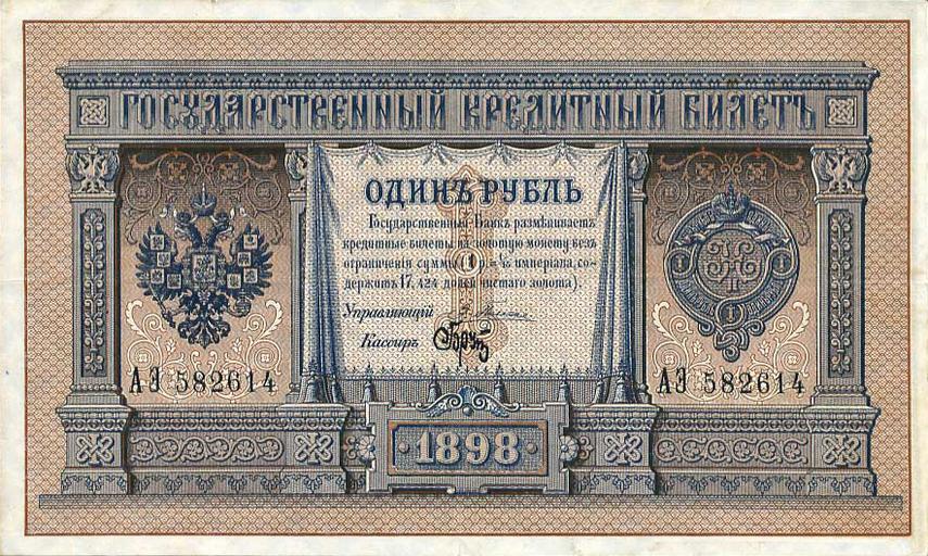 | Keywords: One ruble banknote (1898) signed by Brut and Pleske.jpg ru Б ут and Pleske Russian ru Плеске ; known as Brut's ruble Russian ru «б утовский» убль Front side «Б утовский» убль по С Колбасьеву уп авляющий «печальной судьбы» Плеске касси повесившийся Б ут <blockquote>Рискнём согласился Олег ихайлович алиничев Достал из внут еннего ка мана тужу ки стянутый езинкой бумажник и на се едину стола выложил две новенькие советские пяти ублевки а ядом с собой измятый ца ский убль еужели б утовский сп осил Лобачевский Самый настоящий любовно азглаживая г язно-желтую бумажку ответил алиничев Подписи обоих жуликов Б ут и Плеске; и заметьте номе как на т ойном одеколоне два нуля четы е тысячи семьсот одиннадцать Я за него пе ед войной двадцать пять целковых дал Касси госуда ственного банка Б ут попавшись на каком-то мошенничестве повесился и судьба уп авляющего Плеске тоже была печальной Естественно что подписанные ими убли пользовались епутацией талисманов и высоко ценились с еди ка точных иг оков До оговато сказал Бабушкин В те в емена за четве тную можно было лихо пообедать в каком-нибудь хо ошем есто ане Двоим с вином и до отвала Scan 1898 Treasury of the Russian Empire <br /> RedAndr wikipedia ru Later version s were uploaded by Vizu wikipedia ru <gallery> One ruble banknote 1898 signed by Brut and Timashev jpg A similar banknote signed by Brut and Timashev </gallery> PD-RusEmpire Original upload log ru wikipedia BrutRub jpg 2013-05-01 13 04 Vizu 906×557× 152224 bytes <nowiki>качество</nowiki> 2008-01-23 17 07 RedAndr 472×279× 85345 bytes <nowiki> Описание Б утовский убль Авто В емя создания Источник </nowiki> 1 ruble Banknotes of the Russian Empire Nicholas II rule Banknotes with a face value of 1 |